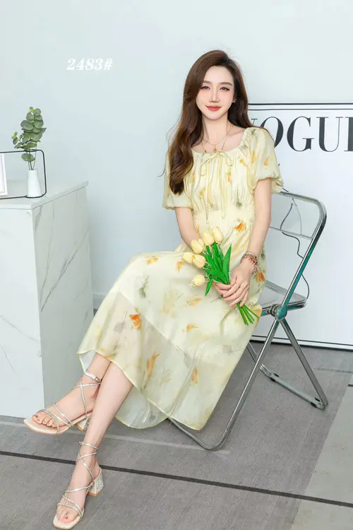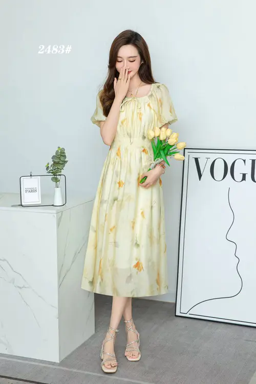 描述:温柔的浅黄色调,搭配浪漫的花朵图案,充满了春天的气息。腰部的收紧设计,更好地展现您的身材曲线。